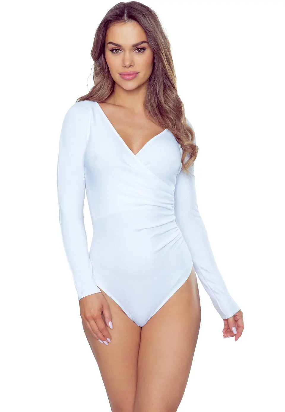 Moteriškas ir stilingas body, pasiūtas iš minkštos, elastingos, gofruotos viskozės. Elegantiškas prigludęs siluetas, ilgos rankovės bei subtilus įvyniojamo tipo (kopertinis) dekoltė suteikia išskirtinio žavesio. Šoninis klostavimas optiškai formuoja figūrą, o patogus trijų eilių kabliukų užsegimas užtikrina komfortą dėvint.
