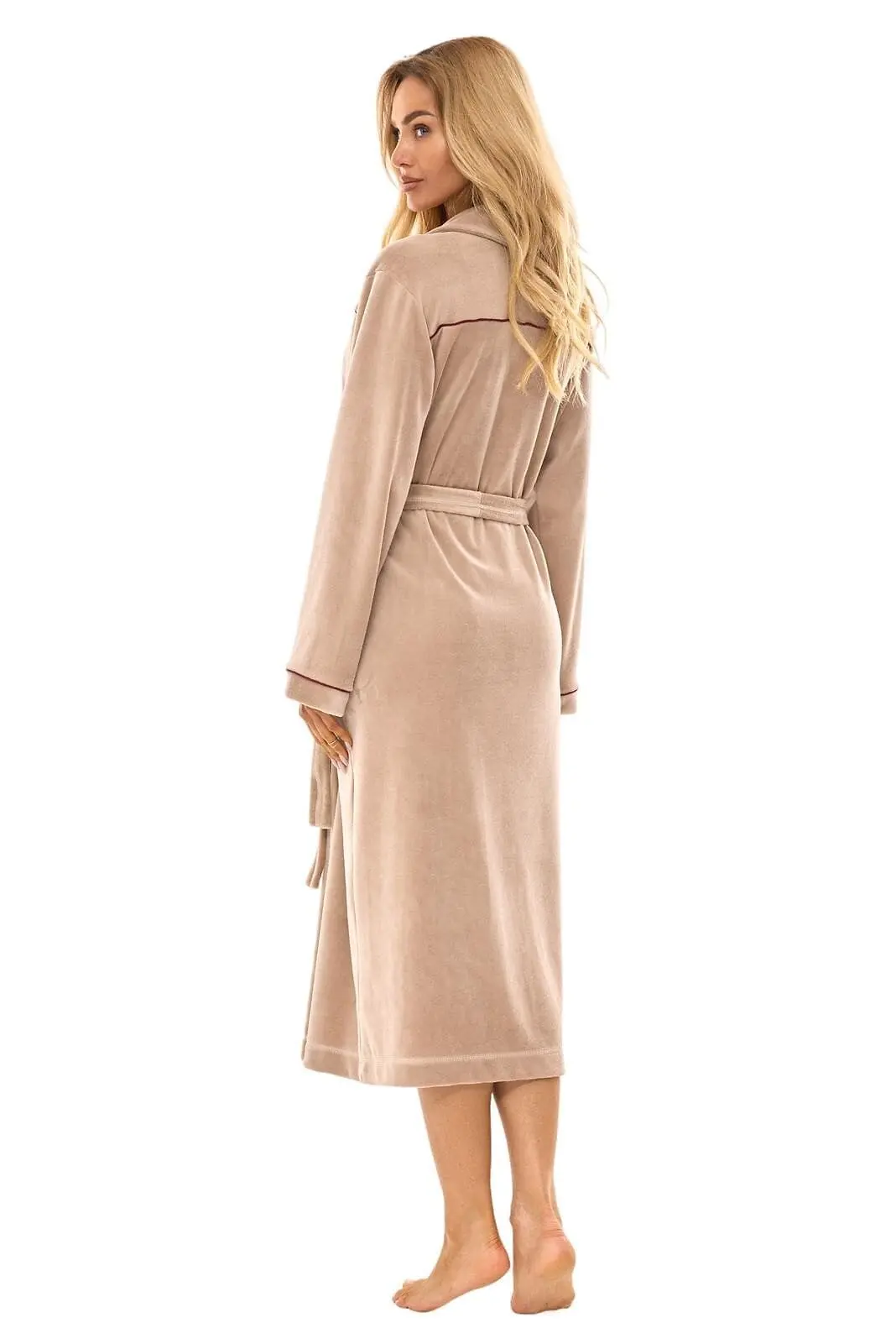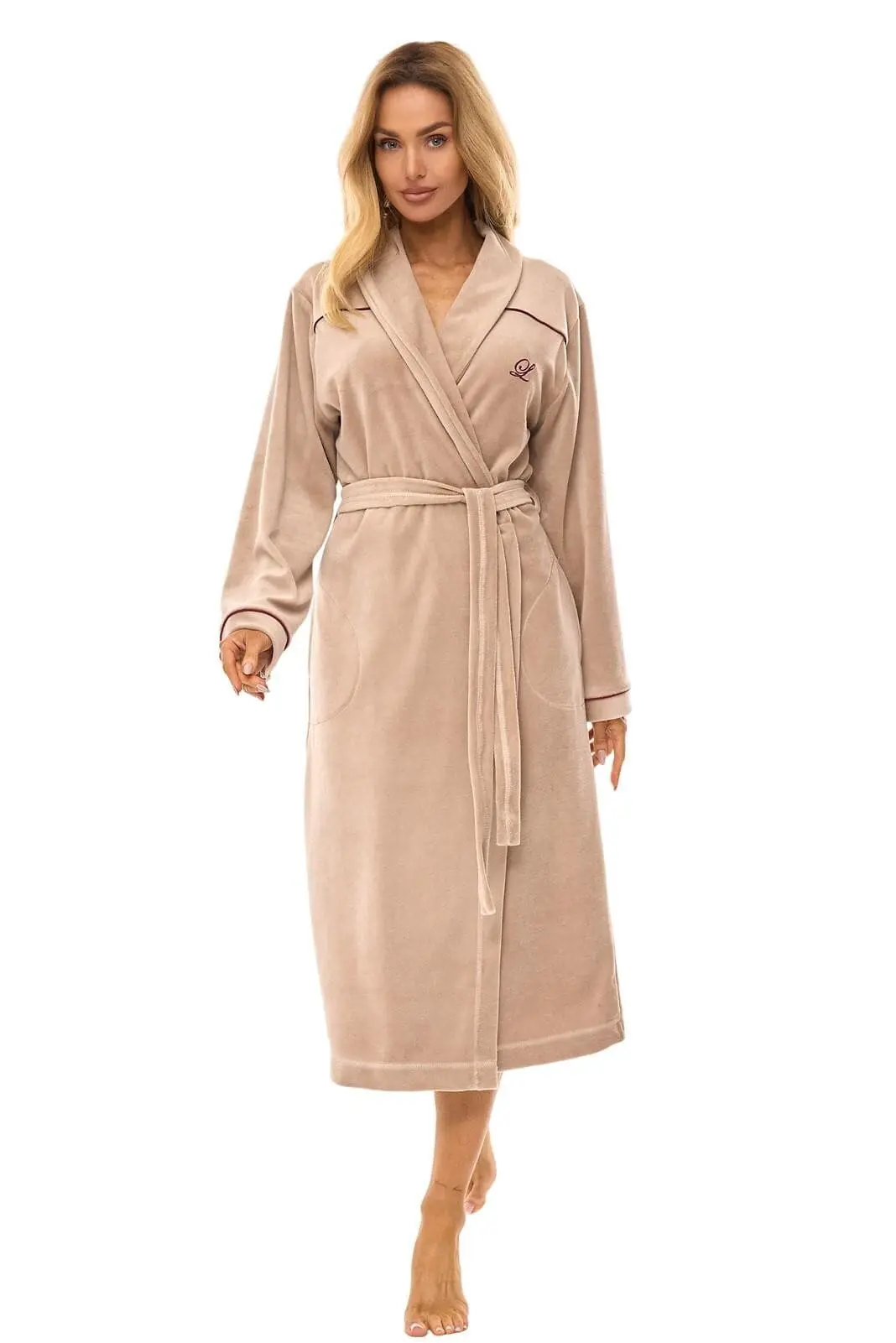 Ilgas moteriškas chalatas, pasižymintis klasikiniu kirpimu ir elegantišku dizainu. Pagamintas iš švelnios, aksominės tekstūros medžiagos, maloniai priglunda prie kūno ir suteikia komforto. Modelis su šalio tipo apykakle, ilgomis rankovėmis, juosmens diržu bei patogiomis kišenėmis ties klubais. Subtilus siuvinėjimas ir dekoratyvinė juostelė suteikia ypatingo žavesio.