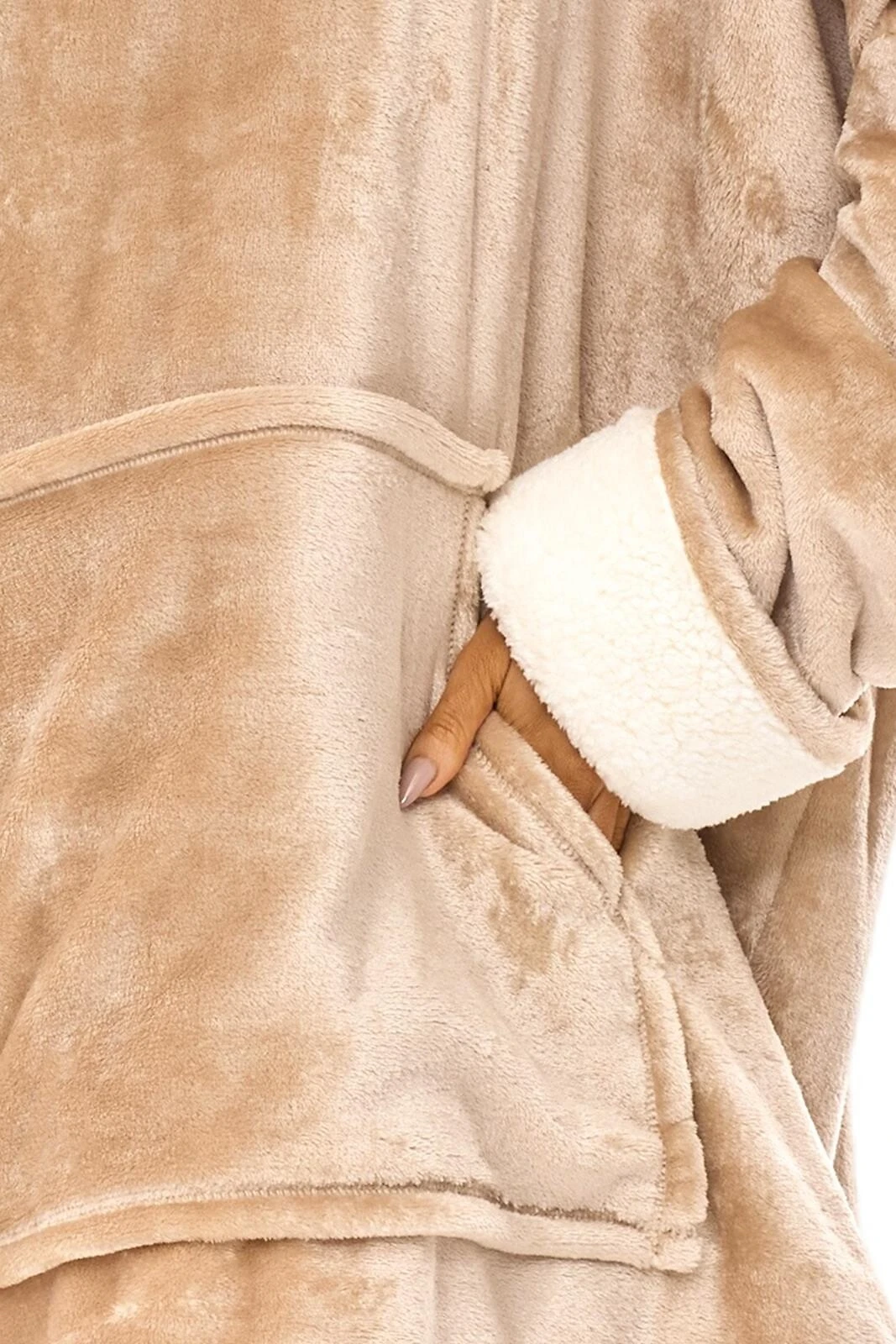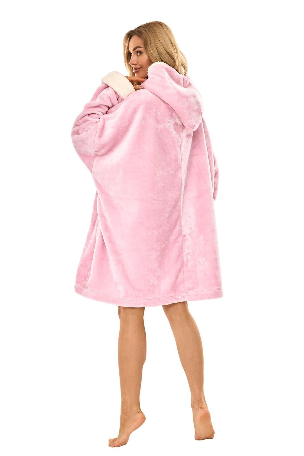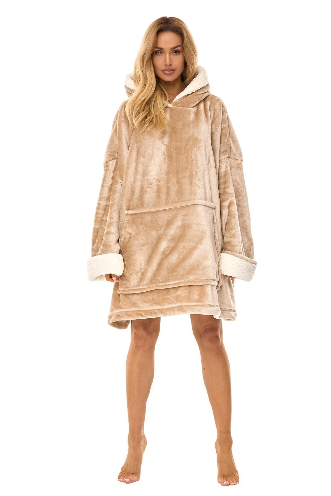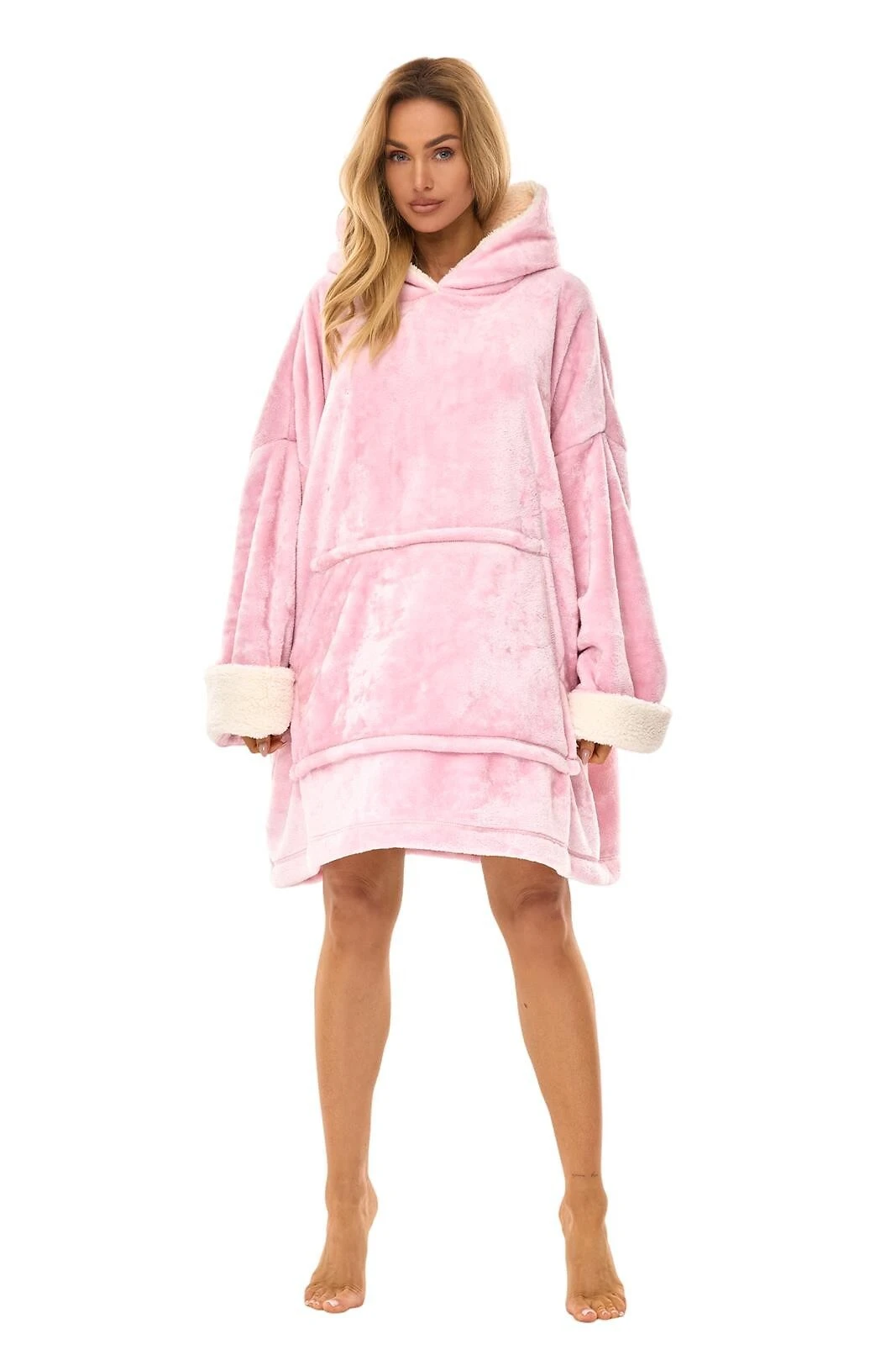 Modelis turi patogų kapišoną su vidine „baranko“ tipo apdaila, kuri suteikia dar daugiau jaukumo. Plačios rankovės su atvartais ir priekyje esanti didelė „kengūros“ tipo kišenė suteikia praktiškumo ir stilingo laisvalaikio pojūtį. Universalus dydis prisitaiko prie įvairių figūrų, todėl chalatas puikiai tinka kiekvienai moteriai.