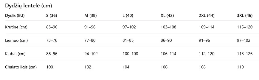 Kad rastumėte sau tinkamiausią dydį, tiksliai išmatuokite savo krūtinę, liemenį, klubus prieš pateikdami užsakymą. Kiekviename produkto puslapyje rasite išsamią dydžių lentelę, kuri padės pasirinkti.